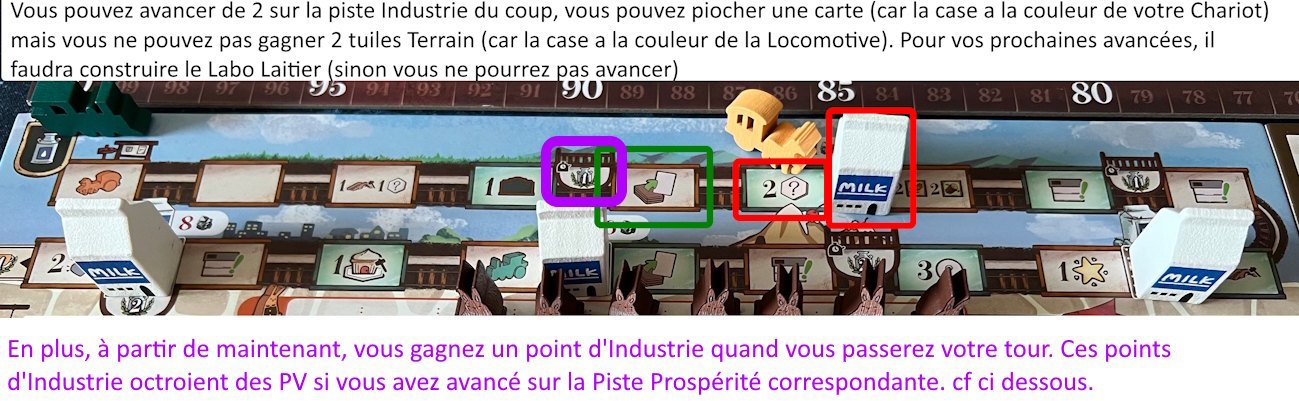 - Progresser sur la piste Industrie : vous disposez d’un chariot (qui débloquera plus tard la locomotive et) qui est stoppé par un type de Bâtiments (Labo Laitier) qu’il faudra construire pour avancer. Cette piste donne des bonus au chariot OU des bonus à votre locomotive (quand ils passent sur la case ou s’y arrêtent).