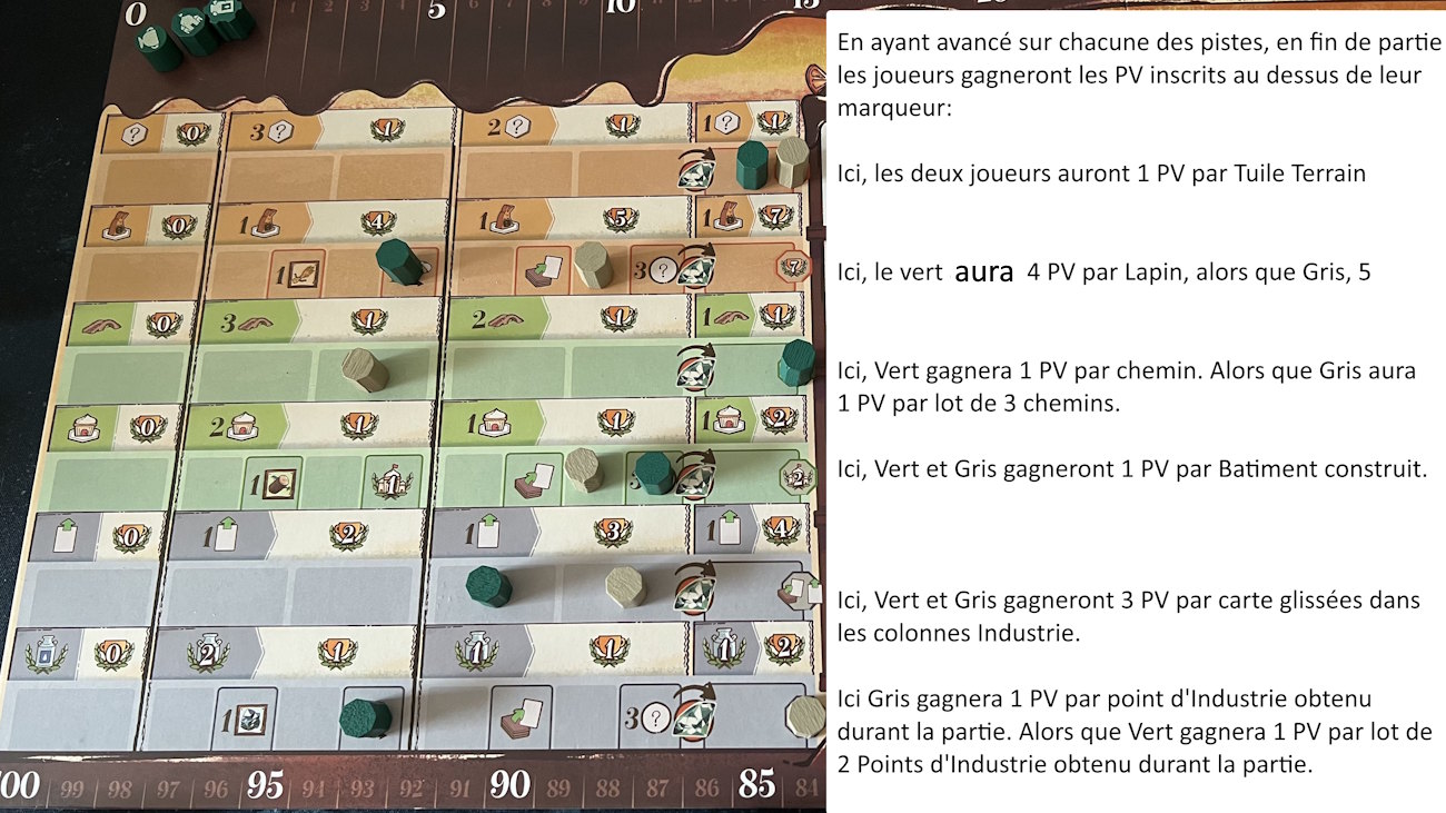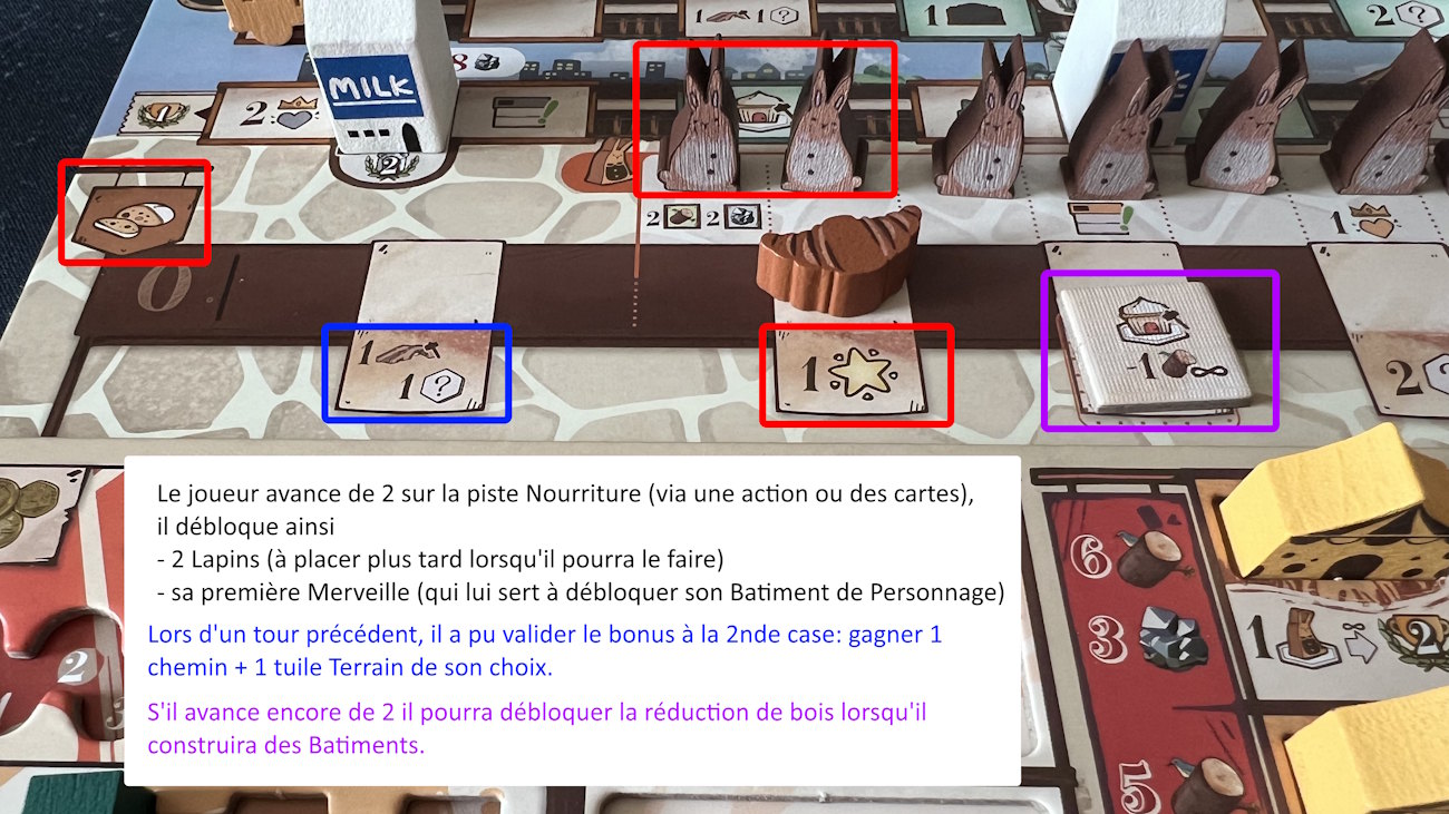 - Choix Cornélien 2 : L’ordre des différentes pistes sur lesquelles progresser (6 pistes de Prospérité, 1 piste Nourriture, 1 piste Industrie). J’ai du mal avec les pistes, de manière générale, je trouve cela inintéressant (c’était ma crainte d’ailleurs sur ce jeu). Mais finalement, on ne joue pas que sur elles et quand on progresse sur ces pistes, on y débloque des bonus intéressants …