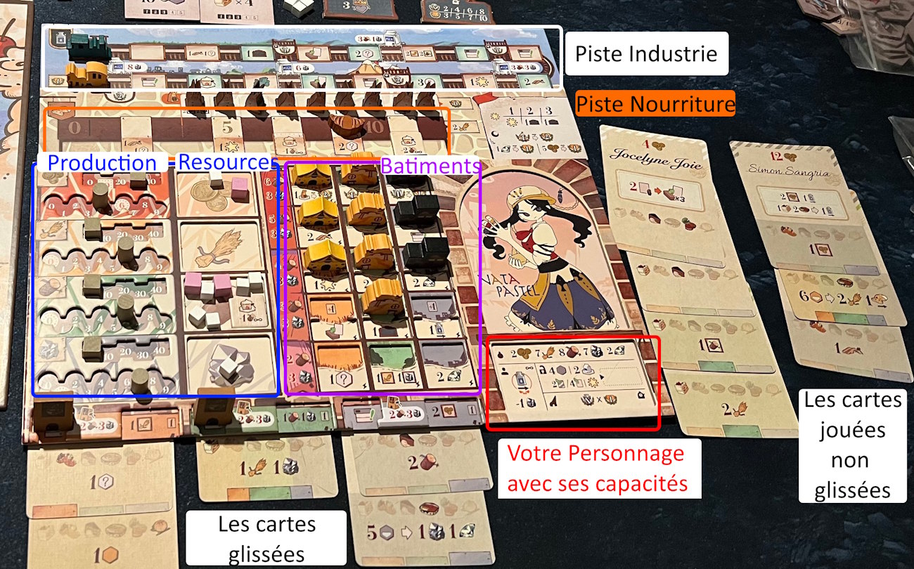 - Améliorer votre plateau personnel : via des cartes que l’on glisse dessous, en construisant des bâtiments, on avançant sur la piste Nourriture, en débloquant des bonus diverses et variés sur la Piste Industrie… Tout cela en espérant activer le pouvoir de votre Personnage plusieurs fois dans la partie. Personnage fortement Asymétrique (dans les bonus des bâtiments, les capacités …)