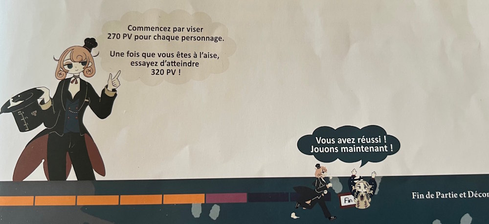 Petite touche sympa sur les règles, il y a une barre de progression qui vous indique où vous en êtes sur la lecture des règles avec « courage, vous êtes à la moitié » etc. Et en fin de règles avec le décompte final, un personnage vous défie de faire 270 points. (Mon meilleur score : 238 PV, on pense en être proche mais c’est à la sueur de notre front que ça se joue)