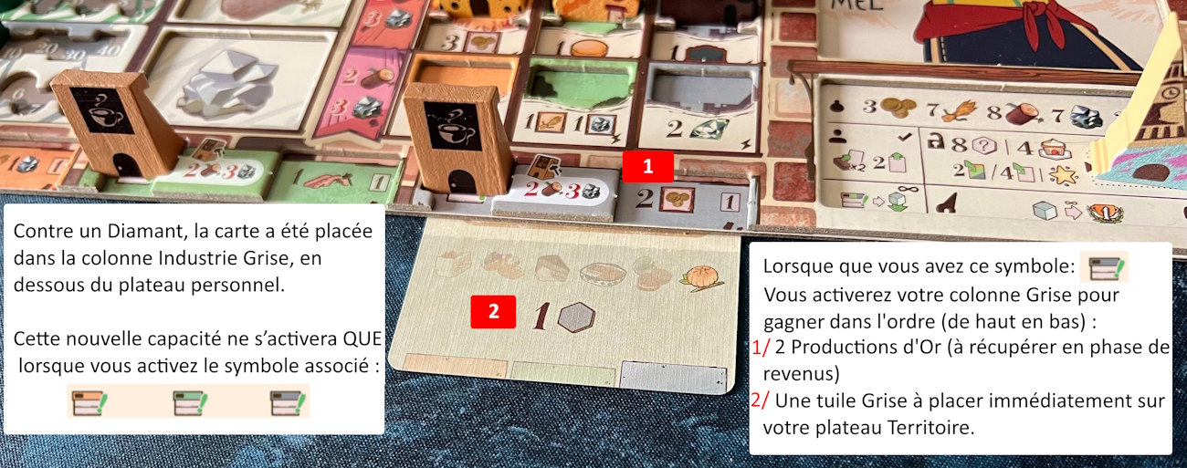 - Jouer une carte Citoyen et éventuellement en payant un diamant, la mettre dans une colonne d’Industrie pour ses bonus à venir