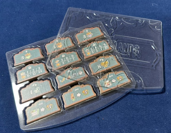 Pour réduire le temps de mise en place, l’upgrade pack du KS propose un support pour les tuiles Compétences qu’on a en triple exemplaires et qu’il faut classer sur le plateau principal. Clairement le bienvenu (en plus des sleeves magnifiques) :