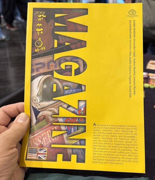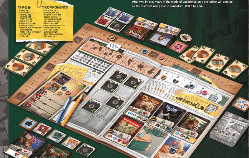 Ici, un petit jeu de placement d’ouvriers et de collection. Vous allez chercher à récupérer des tuiles représentant le « type d’articles » et des cartes qui forment la « une de magazine » permettant de scorer ou récupérer de l’argent.