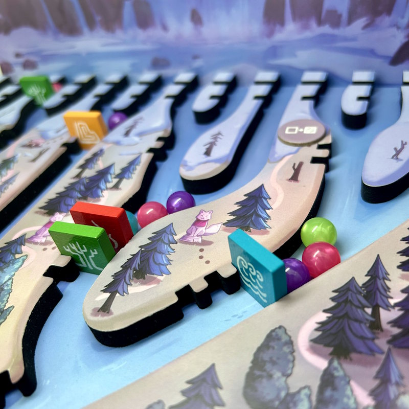 En effet, quand tous les joueurs ont joué leurs tuiles, on libère les perles du haut du plateau qui vont s’écouler le long des rivières jusqu’au lac. Chaque barrage permettra à son propriétaire de récupérer une perle bloquée.