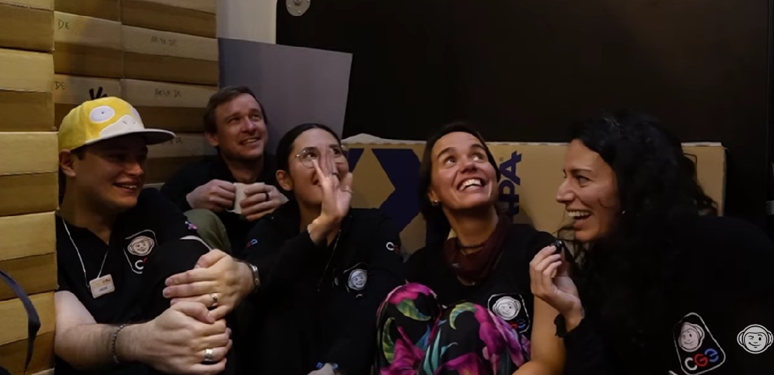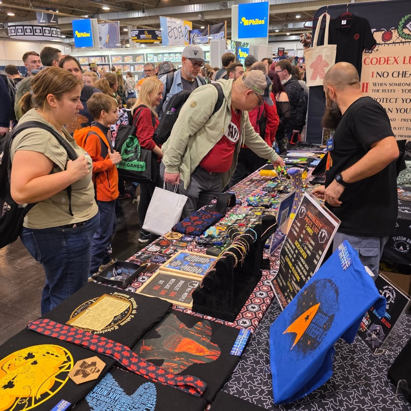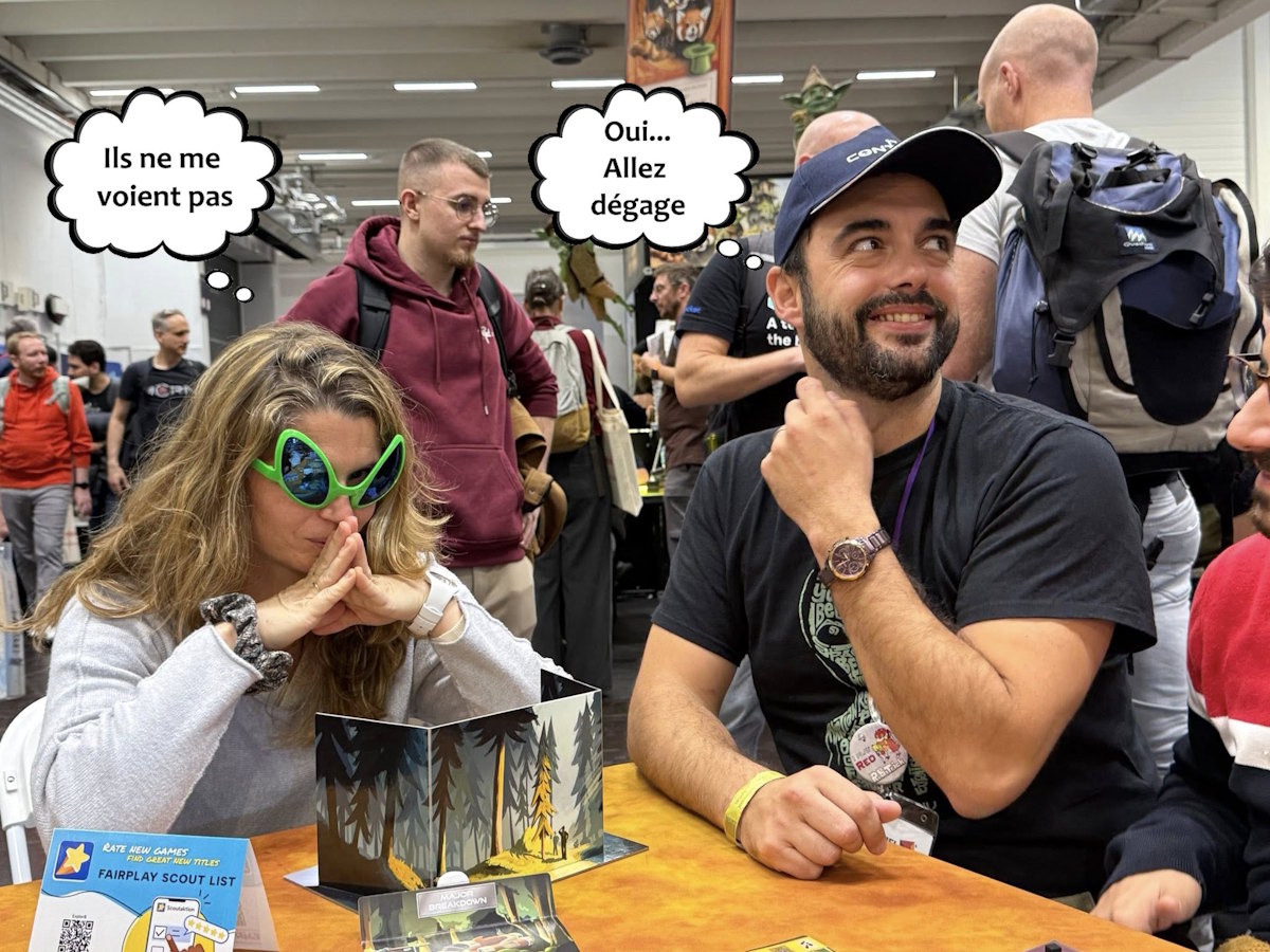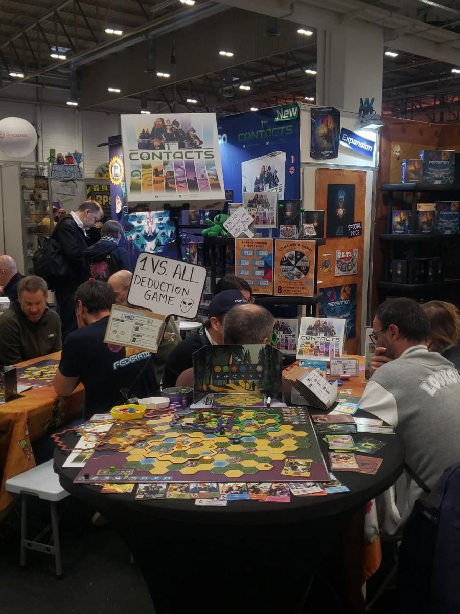 A propos de CGE, les équipes faisaient des pauses régulières derrière le stock. Le stand n’a pas désempli, ils commencent à être épuisés. D’ailleurs ils parlent de leur énorme hébergement dans lequel une centaine de personnes jouent (c’est une sorte de campus qui peut accueillir jusqu’à 180 personnes). Cela va devenir une anecdote car l’hébergement est en plein milieu d’une forêt avec des punaises puantes et piquantes.