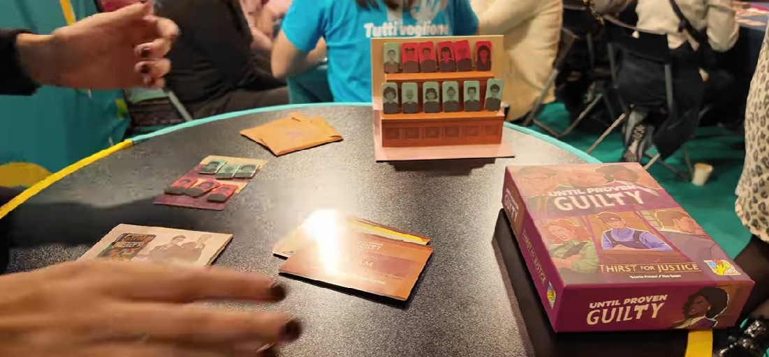 Sur le vlog de Crimson Board Games, on peut y avoir le nouvelle boite (Thirst for Justice) du jeu Until Proven Guilty / jeu d’enquête dont vous jouez un avocat qui tente de convaincre un jury (Jury que vous voyez sur le support, dans la photo ci-dessous). Si vous aimez comme moi la série Bull, vous devriez apprécier le jeu.