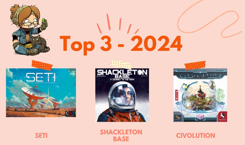 - SETI (13 parties) : j’aurai aimé y jouer encore plus cette année car c’est un énorme coup de cœur et j’attends avec impatience la sortie de l’extension.