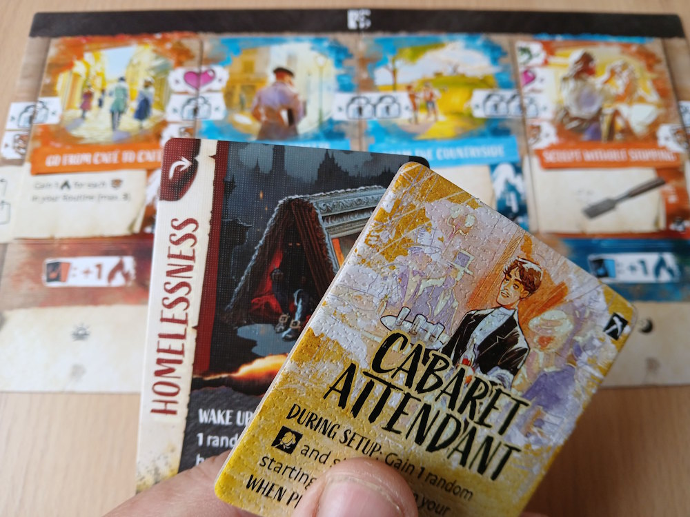 Ce que j’aime bien c’est que les cartes s’activent quand elles sortent de votre plateau personnel (c’est comme une frise du temps qui avance… jusqu’à les valider) et celles déjà sorties pourraient être activées de nouveau selon conditions. Ce système de combo me plait énormément. Du coup, la mécanique est validée. Parlons du thème ?! Ces cartes vont servir à conquérir des lieux. Ca me rappelle fortement Abyss, car dès qu’on avait un lieu on perdait les pouvoirs des seigneurs. Et là ce sera pareil, on va perdre le pouvoir de nos camarades durement acquis.