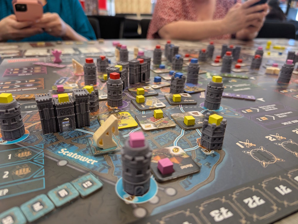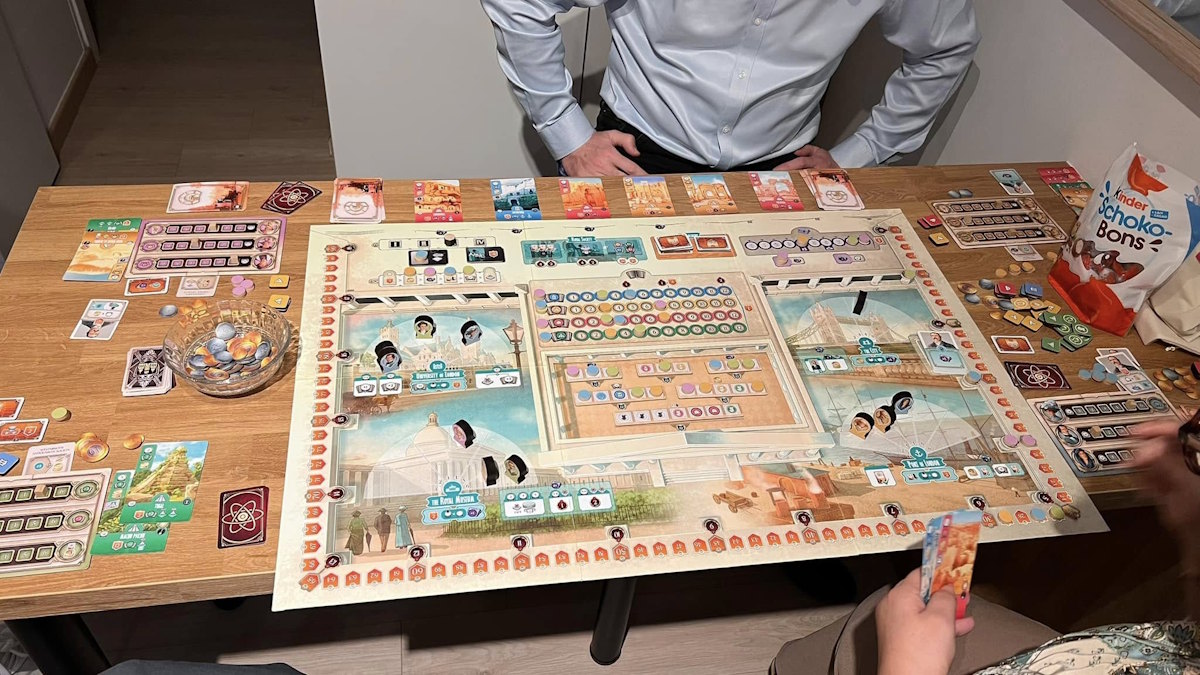 Un plateau chargé, des règles denses, et une course pour compléter l’horloge de Prague (the famous) MAIS on hésite, on doute, on lit plusieurs fois les règles en diagonale, elles donnent le tournis soyons honnête… puis là, le graal : Rahdo le cite comme l’un des meilleurs jeux de 2025. C’était la petite annonce qui nous manquait pour sauter le pas.