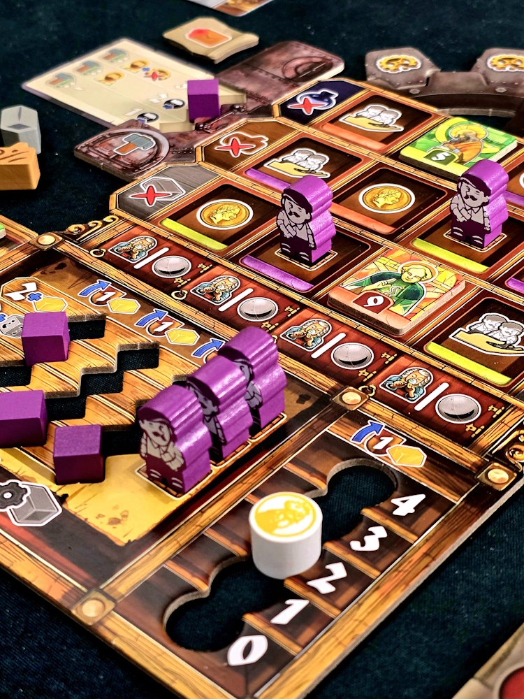 Ce jeu combine dés évolutifs (non lancés), pose de tuiles, gestion de ressources, et placement d’ouvriers / dés.