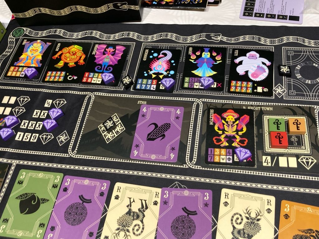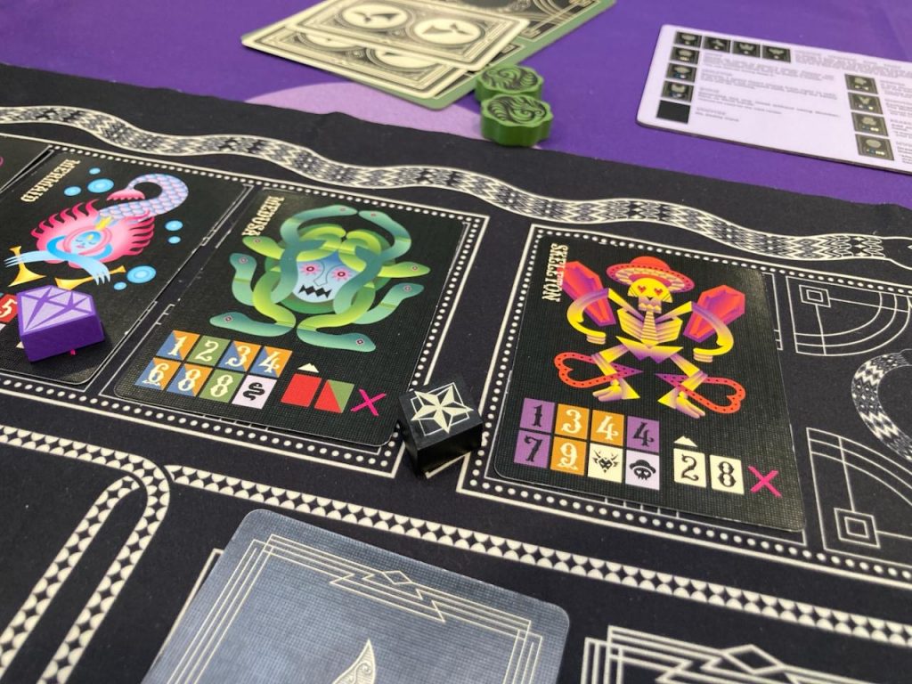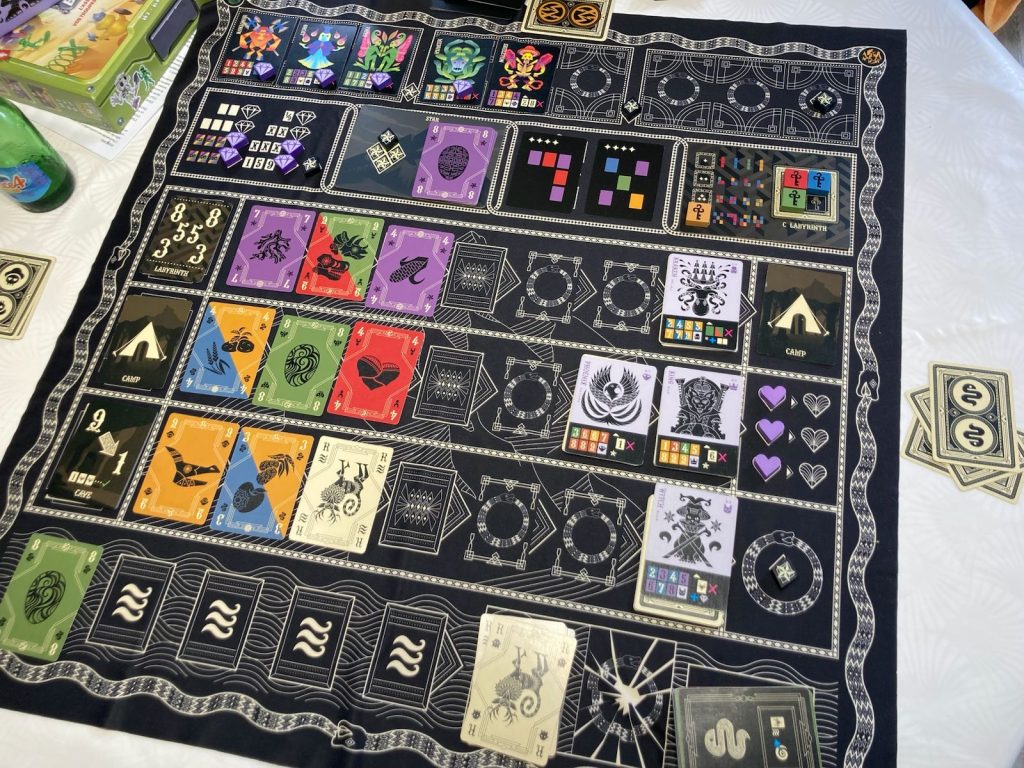 Toute cette histoire commence par une promesse aperçue au FIJ à Cannes, en février dernier : un jeu de cartes attire mon regard par ses illustrations plutôt inhabituelles et un parti pris graphique qui me plaît beaucoup. Le (grand) plateau de jeu, très intriguant, en tissu fait aussi son effet. Le pitch me dit que ce jeu doit, va, me plaire… hélas pas le temps, pas de place, pas les partenaires ce jour-là.