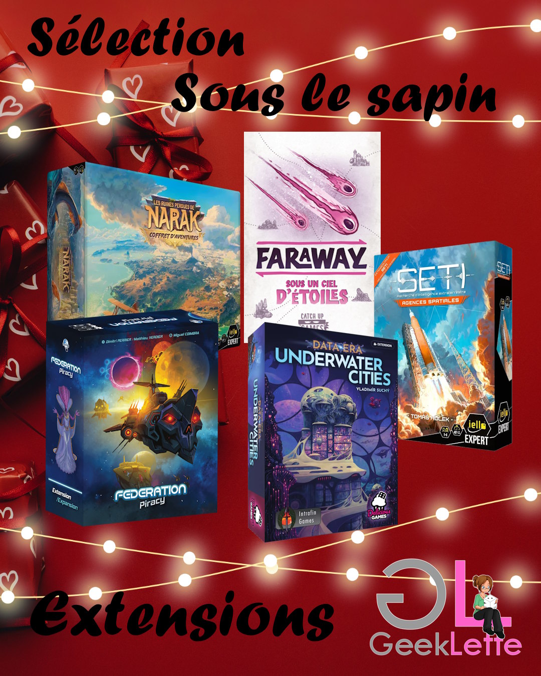 • SETI (Liens d’achat Ludum, Philibert) : on reste chez Iello qui sort l’extension de SETI juste avant Noel et ça tombe tellement bien pour remplir sa hotte et compléter son jeu de base. De nouvelles races Aliens, des agences asymétriques et un démarrage boosté ! Que demander de plus ? 🙂 Si vous avez l’âme bricoleuse, il y a aussi des aliens fan-made que vous pouvez imprimer et mettre sous le sapin (surprise assurée!) 🙂