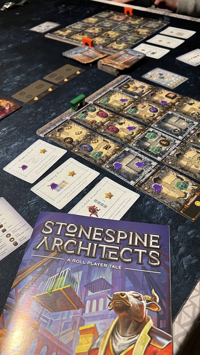 • Stonespine Architects (Liens d’achat LudumPhilibert) on ne dirait pas car la boite est moche mais le jeu est excellent, vous construisez votre donjon avec des cartes dans une grille de 4 x 4 et essayez de connecter les chemins de l’entrée et la sortie de votre jeton en plus de répondre à un certain nombre de critères que vous ne connaissez, pour certains, pas tout de suite.