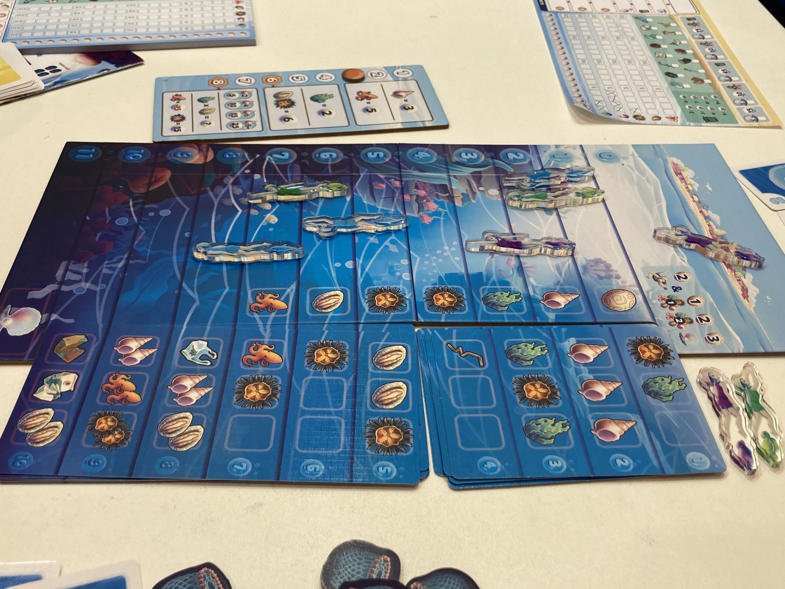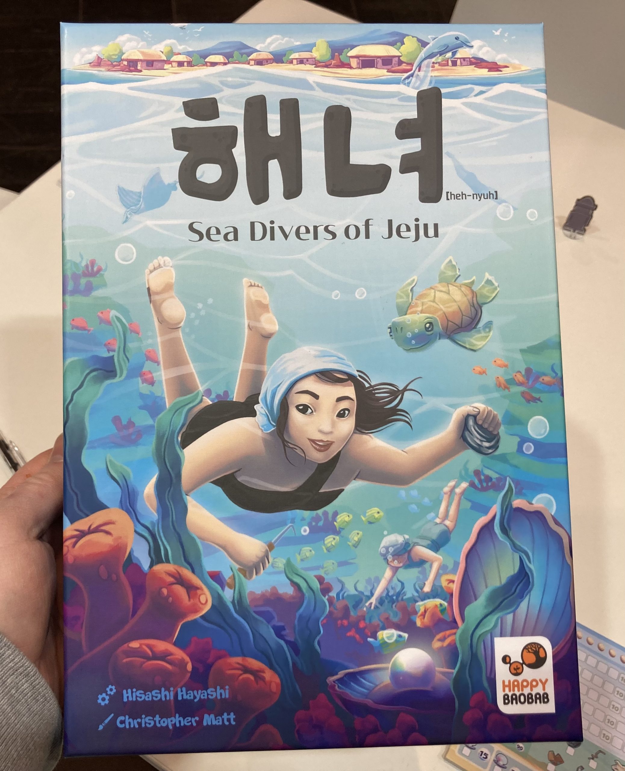 Haenyo qui vous invite à explorer les profondeurs où se trouvent les meilleurs trésors mais sans perdre sa connexion avec la surface sous peine de perdre sa respiration et donc son butin. Le mieux étant aussi de ne pas plonger au même endroit que ses adversaires pour ne pas avoir à partager. Malin, j’ai bien aimé.