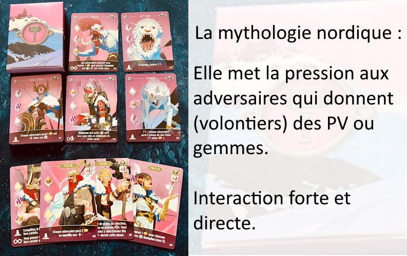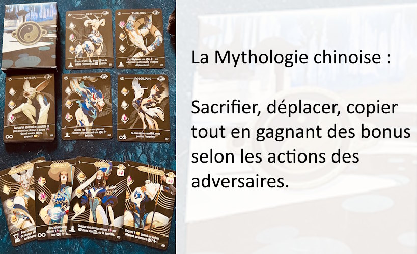 Je ne joue plus jamais sans les mythologies nordiques et chinoises. J’adore ces deux là. Et les deux autres, on les choisit souvent au hasard ou en fonction du niveau de difficulté.