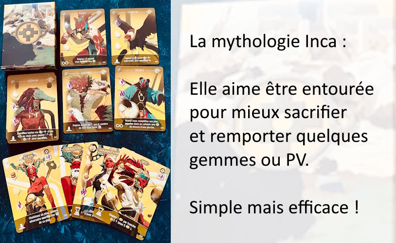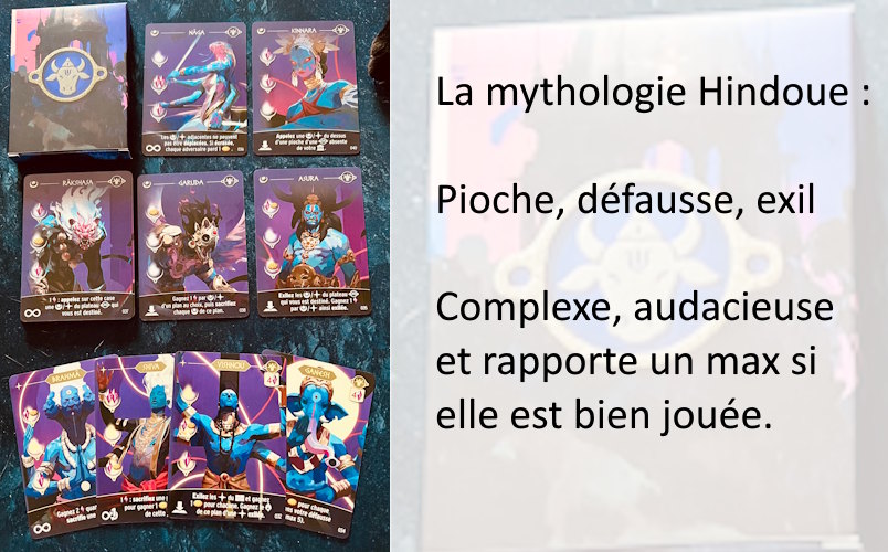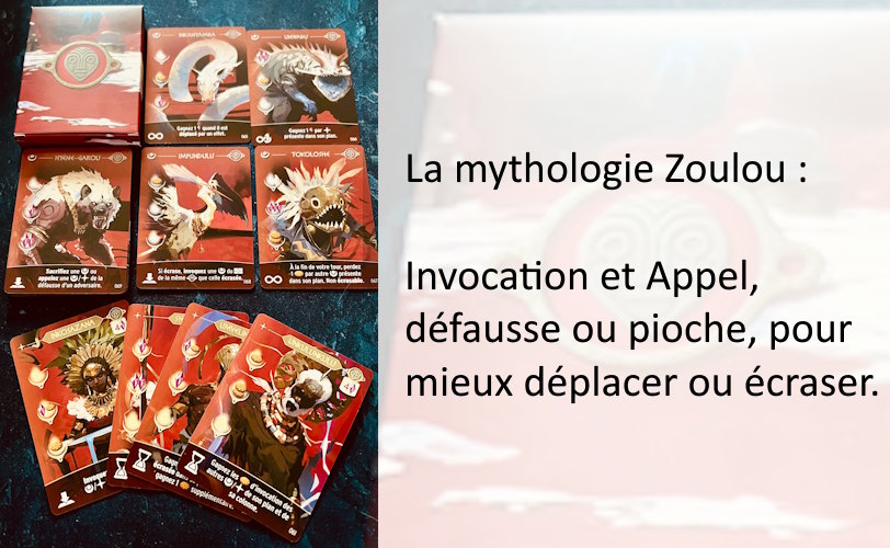 Pour le moment, la Mythologie Zoulou est l’unique Mythologie que je n’ai pas encore découverte. Mais ce sera pour de prochaines parties ^^ Difficile, pour l’instant, de me passer des mythologies nordiques et chinoises, tant elles dynamisent le jeu grâce à leurs interactions et à la manipulation de cartes.