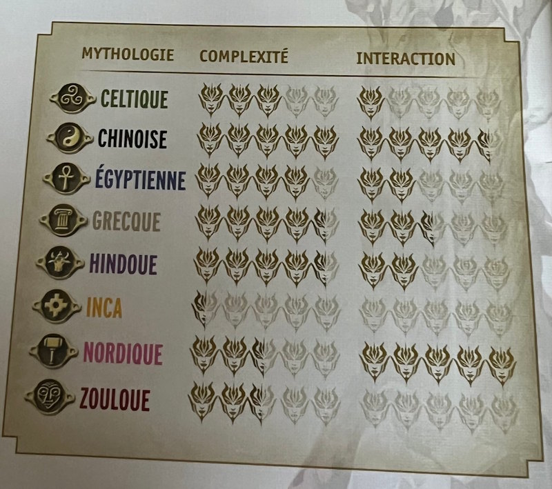 - Il y a des mythologies plus difficiles à jouer, qui apportent un certain challenge pour les joueurs experts notamment.