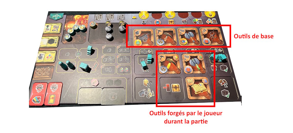 Au début de la partie, vous disposez de 4 outils principaux sur votre plateau personnel. Vous pourrez forger de nouveaux outils mais ce n’est pas une action principale de forger, c’est une action bonus à aller chercher !