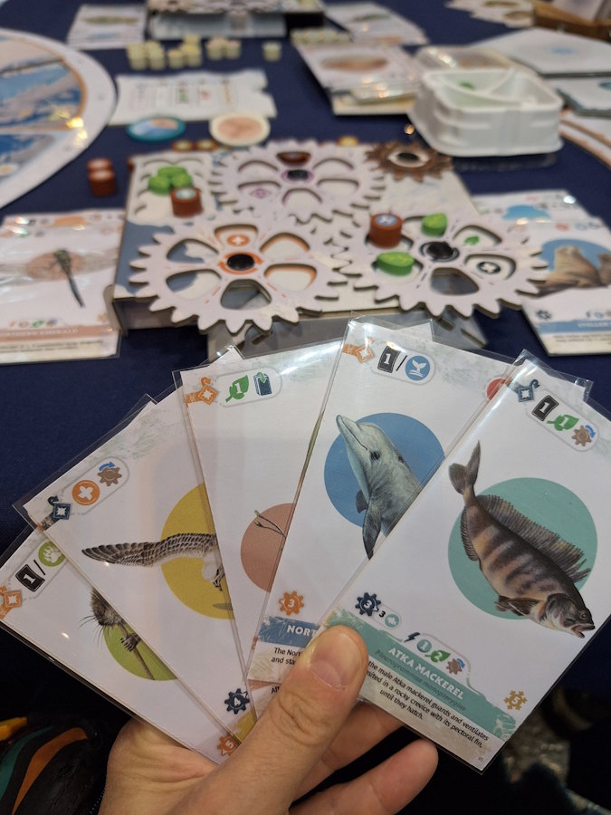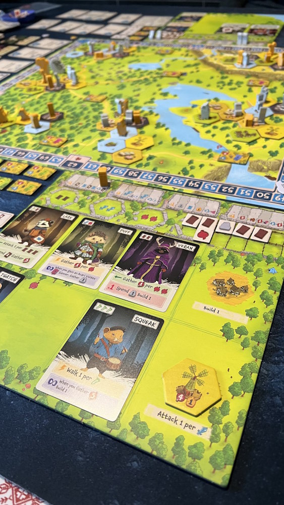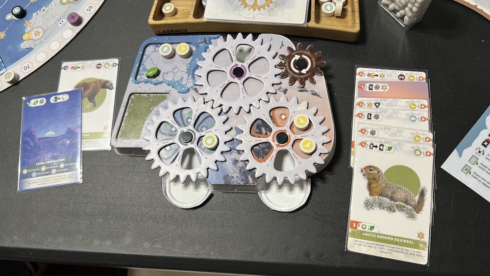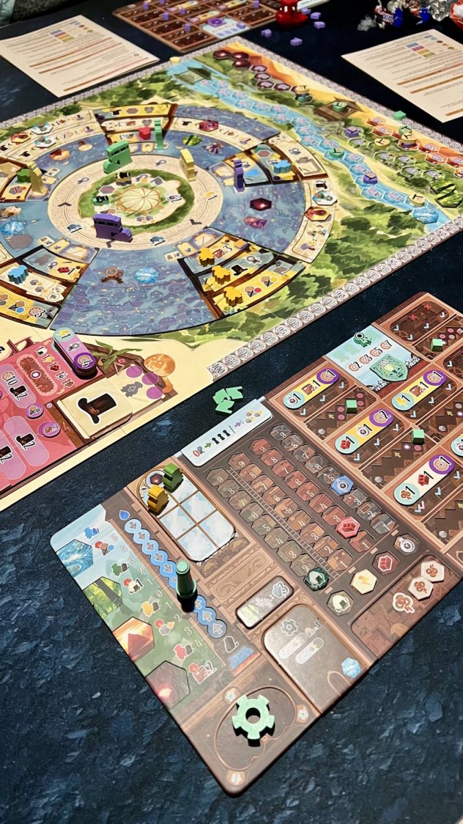 J’adore : la DA est absolument magnifique, la mécanique est soignée et solide, le double deck à gérer (à gauche et à droite) est un vrai casse tête original, la roue qui représente le cycle de (re)production est excellente, l’interaction est forte sur le plateau, le thème est parfaitement exploité, et les cartes qu’on joue participent à la richesse du jeu en plus de faire qq crasses sur le plateau 🙂 L’interaction est souvent positive mais ça grince quand on pique les bonnes places sur le plateau. Les actions sont simultanées (sauf une), ça fait peur au début mais finalement c’est très bien intégré.