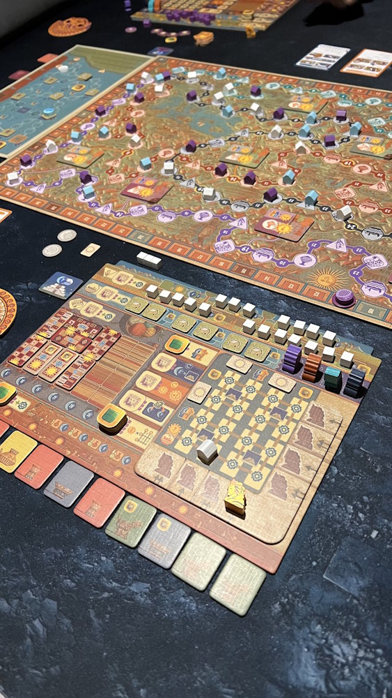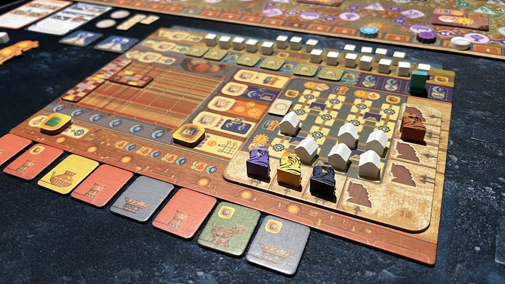 Mécanique : placement de jeton sur une grille d’actions partagée (à l’intersection de deux actions : le joueur actif active deux actions à l’intersection, les autres en choisissent une des deux).