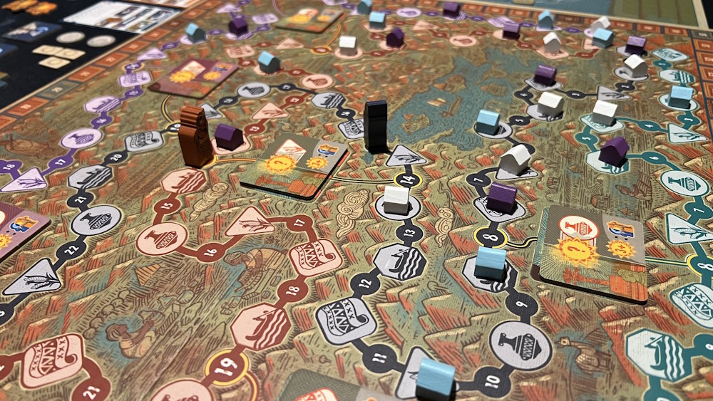 J’aime : la mécanique très originale, la réduction d’actions au fur et à mesure de la partie, l’observation et la négociation constante des joueurs pour éviter de ne pas faire mourir le Ayar de la piste intéressante. Rapidité des tours.