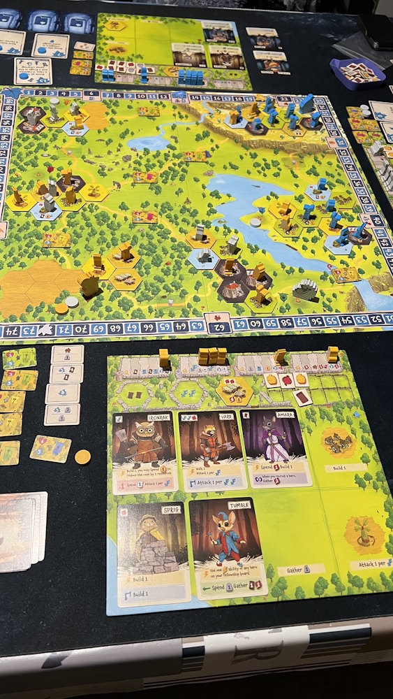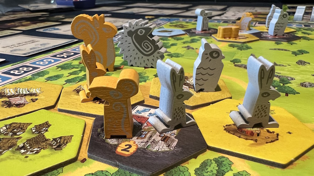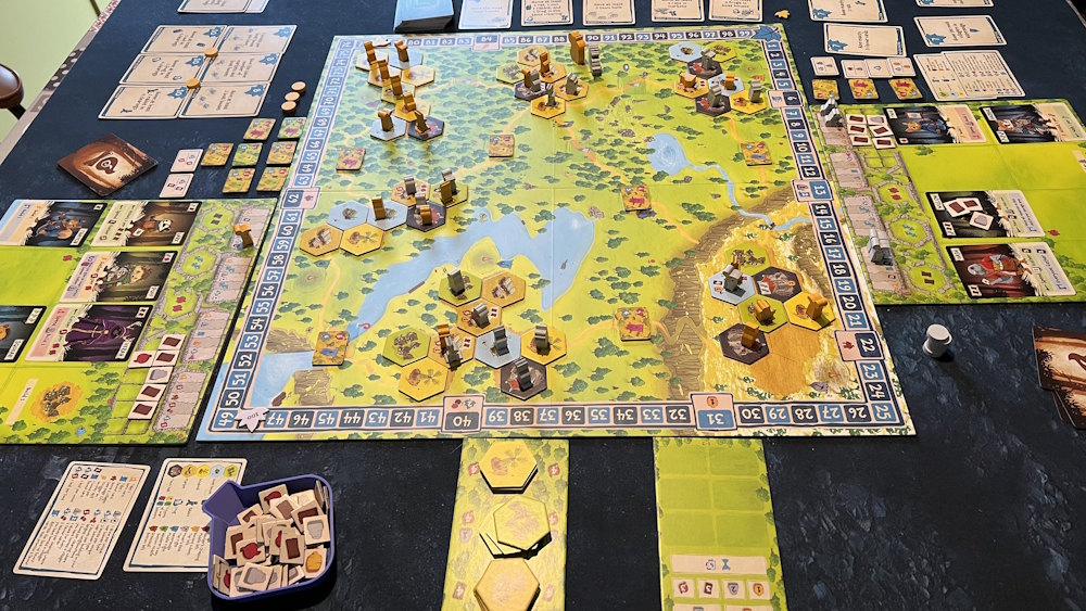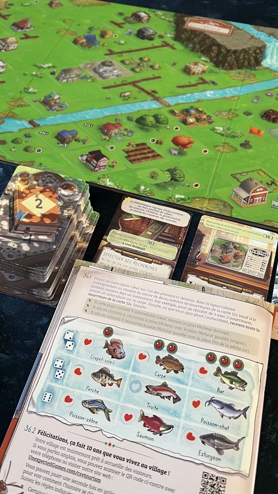 J’aime moins : La durée de partie (1h par joueur). Trop d’objectifs et en plus qui se contredisent donc attention à ne pas prendre n’importe quoi (sauf que la rivière n’est pas toujours sympa).