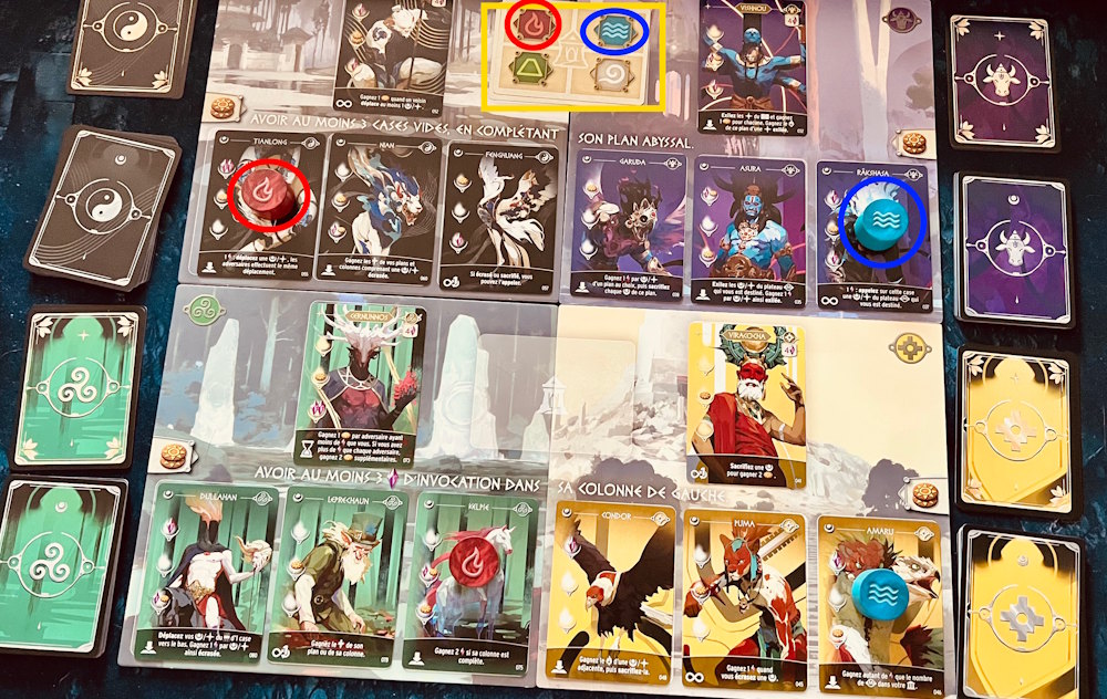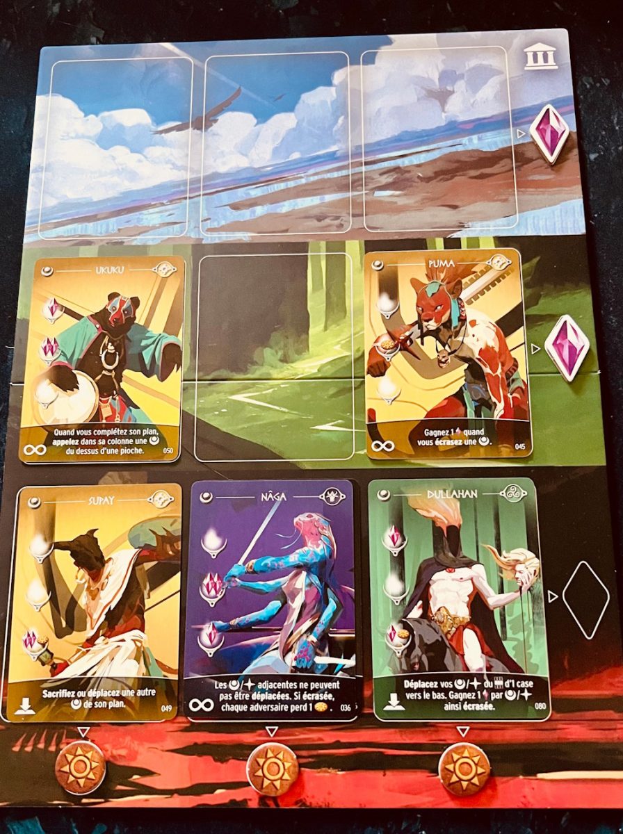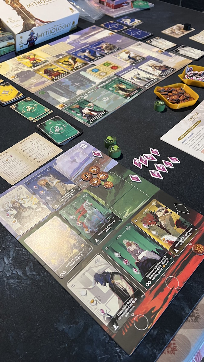 J’aime : la recherche de notre configuration préférée des mythologies, la danse des cartes (plus vos cartes bougent plus c’est bénéfique et dynamique), trouver les synergies entre les cartes, la DA est sublime !! Les auteurs ont tout fait pour que le thème soit présent et cohérent dans les mythologies. Les mythologies à forte interaction ont eu largement ma préférence.