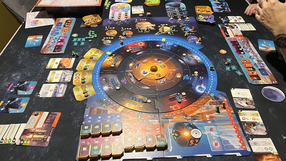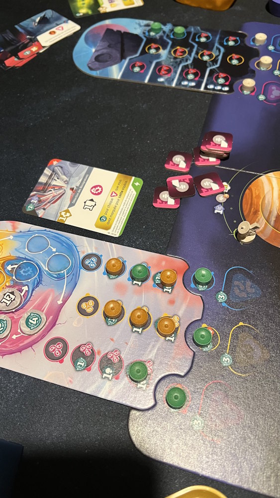 J’adore : la DA, le plateau principal avec les actions qui évoluent (actions accessibles uniquement si vous êtes avancés sur la piste correspondante). Les factions sont asymétriques avec des pouvoirs très sympas, l’arbre technologique personnel et les cartes à jouer m’ont fait adorer le jeu. La durée de partie est en plus raisonnable.