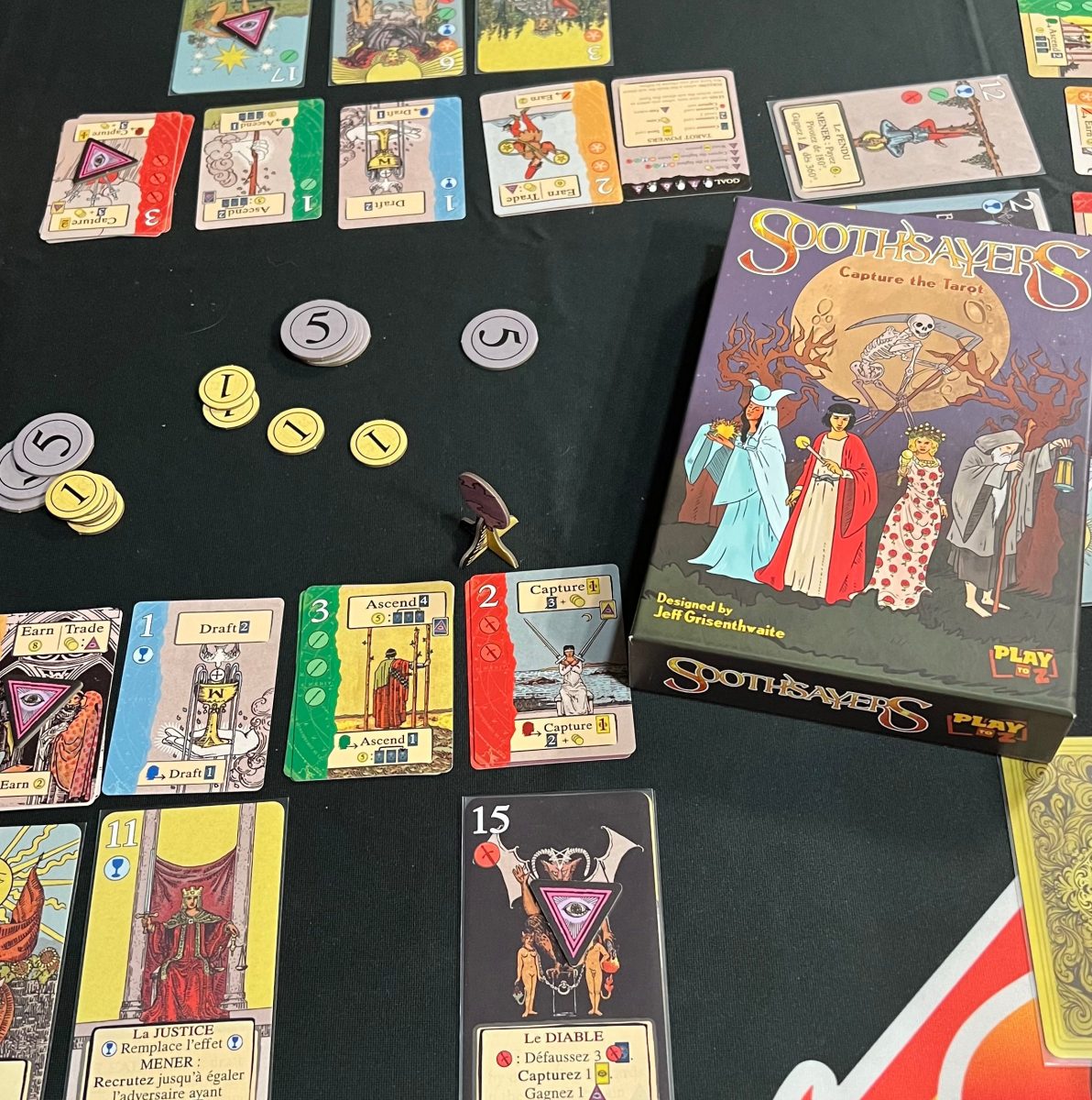 J’aime : l’idée générale est originale, la course à la victoire est tendue, la rapidité des parties va beaucoup plaire, l’interaction est constante (lead + follow), 2 sets de tarots pour renouveler les parties. On vise le joueur qui s’approche de la victoire, il faut donc obtenir ses 2 derniers jetons en sous marin (n’est ce pas ?) 🙂